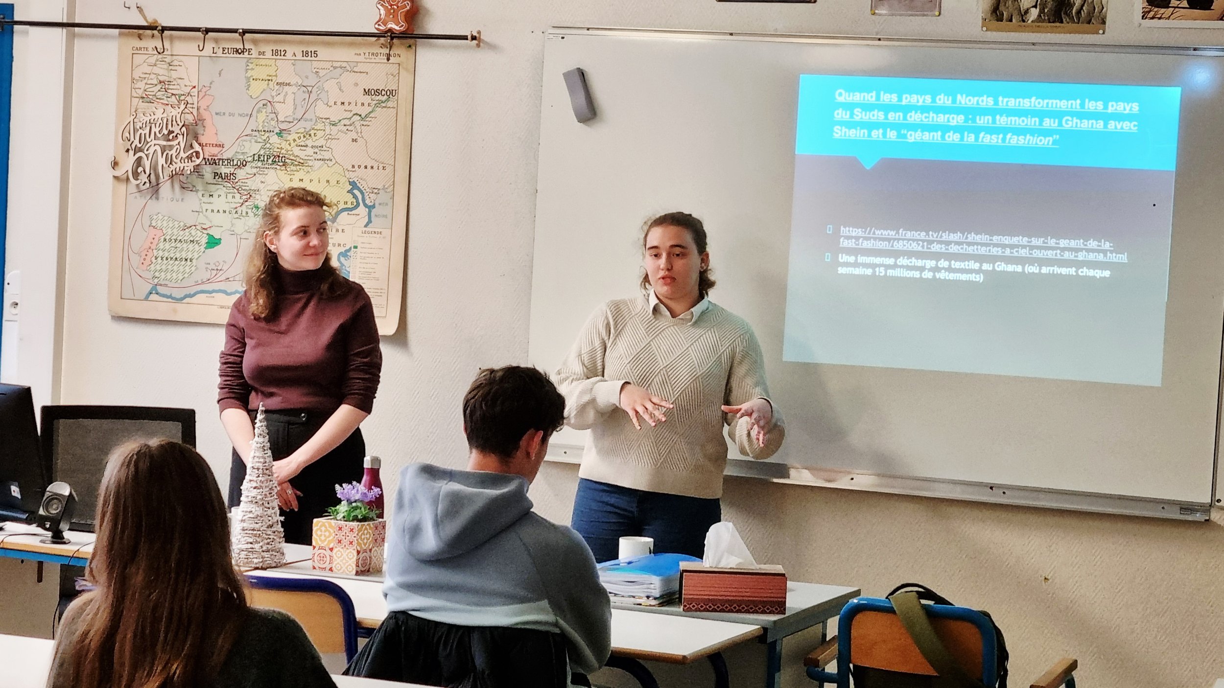 Le lundi 8 décembre 2025, le Lycée Auguste-Chevalier a accueilli Léa et Auriane, deux étudiantes en troisième année du parcours Sciences politiques de Caen, spécialisées respectivement en sociologie et en philosophie. Leur venue s’inscrivait dans une démarche de sensibilisation aux enjeux du développement durable auprès des élèves de Terminale HGGSP et des éco-délégués.