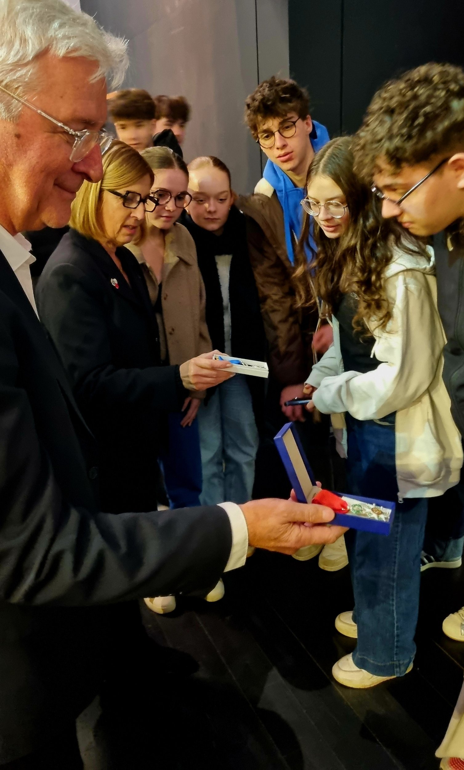 Madame Guerard a rappelé qu’elle-même avait été distinguée en devenant Chevalier de l’Ordre national du mérite, reconnaissance de son engagement au service de la Nation et de la société. Les élèves ont également eu l’honneur d’écouter Joël Mottier, originaire de Domfront et ancien élève du lycée, récemment promu Chevalier de la Légion d’honneur en juillet 2025, distinction officiellement remise à Paris le 10 décembre dernier. Il a rappelé avec force que « la Légion d’honneur nous oblige », soulignant la responsabilité qui accompagne cette décoration. Les élèves ont ainsi pu voir concrètement à quoi ressemblent ces deux prestigieuses distinctions.