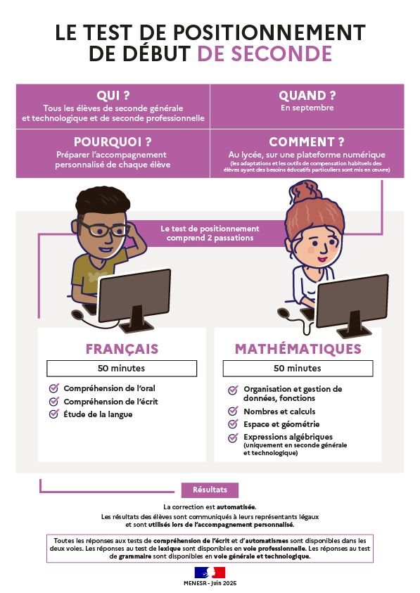 Du 8 au 27 septembre 2025, les élèves entrant en seconde passeront un test de positionnement en français et en mathématiques permettant d’identifier leurs acquis et leurs besoins, de leur proposer un accompagnement personnalisé adapté et de remédier à leurs difficultés éventuelles. Les résultats individuels et par classe seront disponibles dès le lendemain des passations.